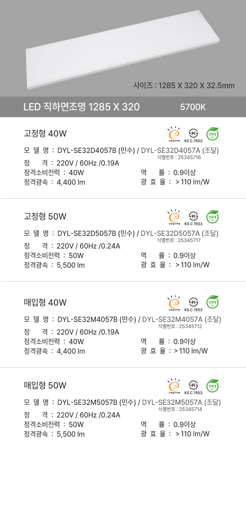 직하면조명 1285X320 고정형/ 매입형 40W 50W
